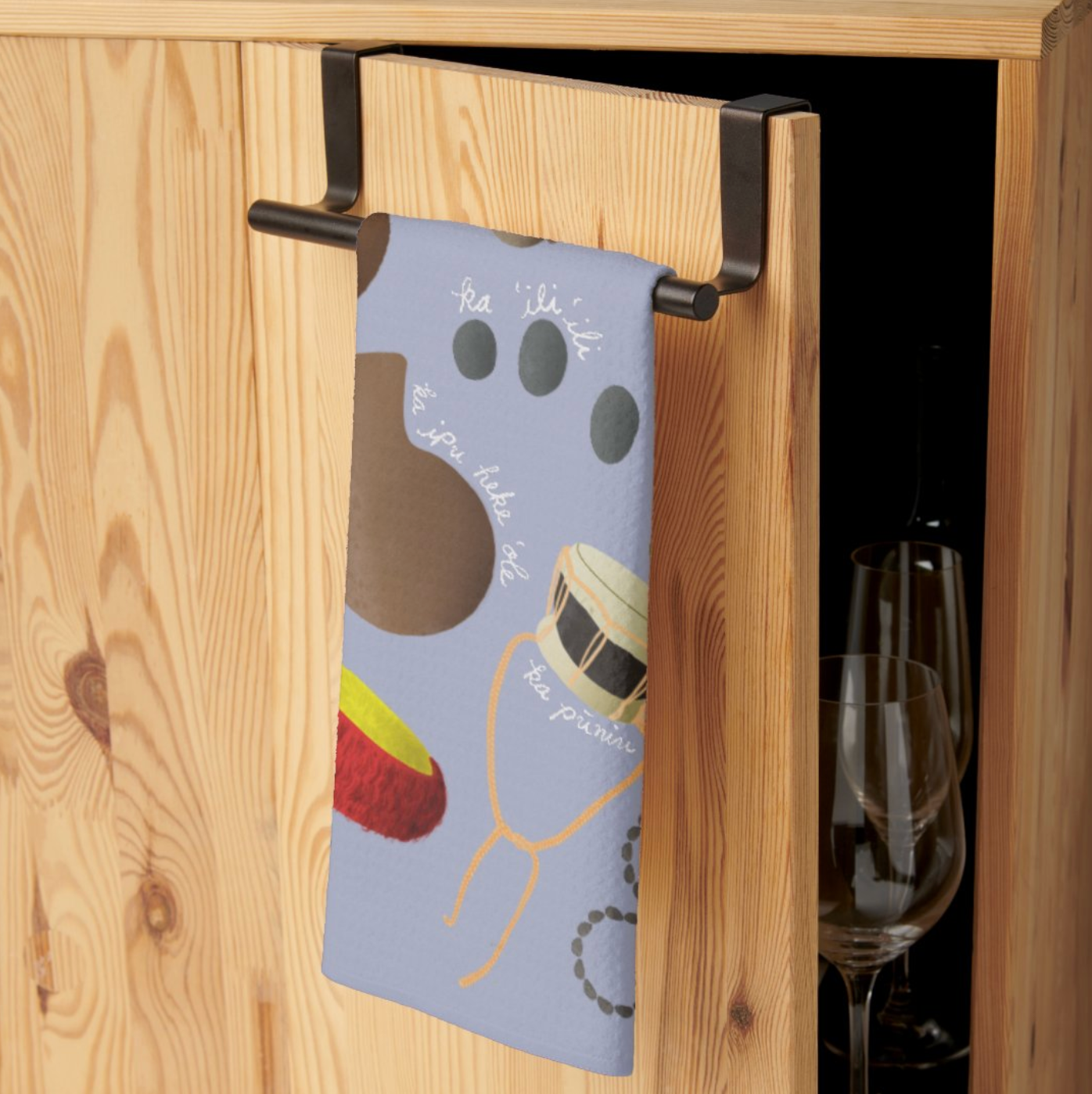 ʻŌlelo dish towels of hula implements. Available in coral pink and gray. Just as hula is delightful because of the hoʻopaʻa, so too is life because of ʻōlelo!